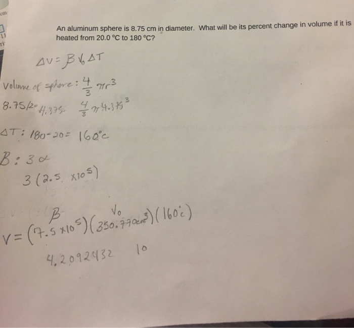 Solved Ii An Aluminum Sphere Is 8 75 Cm In Diameter What Will Be Its Change In Volume If It Is Heated From 30 Circc To 160 Circc